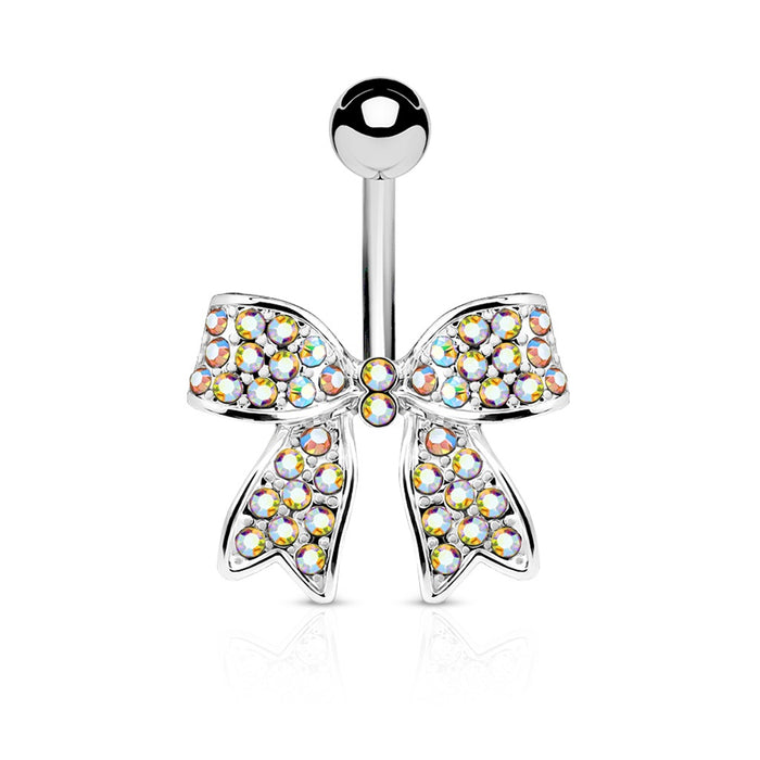 Iridescent Paved Ribbon 316L Surgical Steel Belly Button Navel Ring. Bow belly ring with beautiful sparkles. Width is 3/4". 14GA. 3/8" barbell. 5mm ball top. Available in Clear, Iridescent, Rose Gold and Gold.