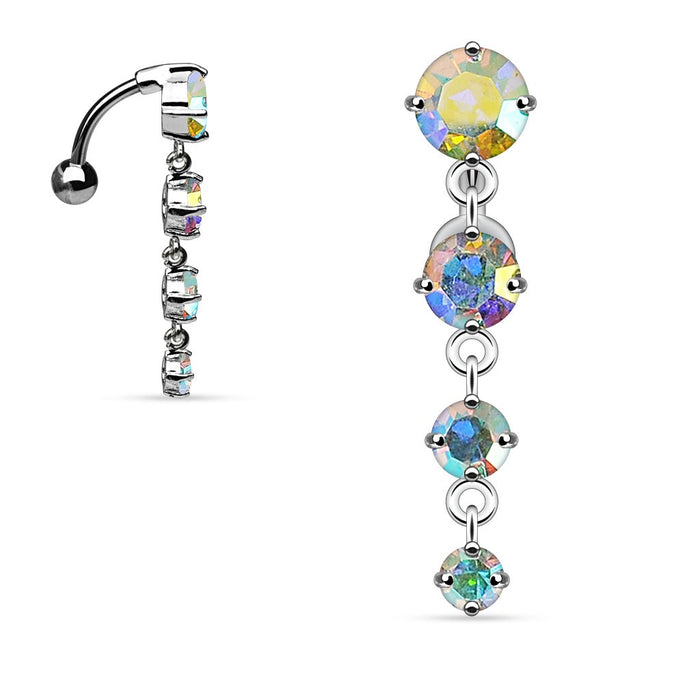 Top Drop CZ Drops Belly Ring has 4 sparkling cubic zirconia gems in a beautiful iridescent color. Total length is 1 3/8". 14 GA. 3/8" barbell 316L Surgical Steel material. Aurora Borealis catches the light and will create a rainbow of colors. Reverse style is a great way to mix things up!