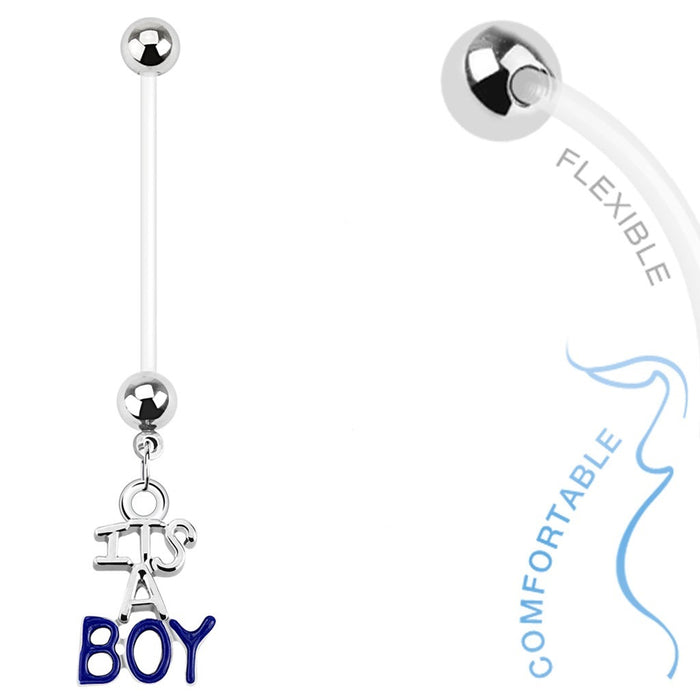 Tell the world It's a Boy with this super cute Pregnancy Belly Ring. Maternity Belly Rings are flexible for a great comfortable fit that is sure to make any proud mom happy! What a fun way to announce your little bundle of joy! 14 GA. 1" barbell length. 5mm Balls. 2" end to end length. Bright blue It's a Boy charm is sure to make people smile.