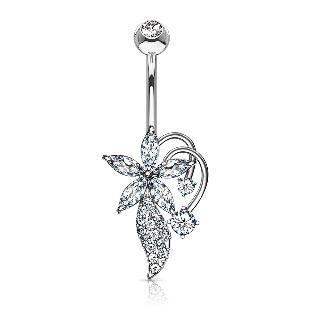 Five Marquise CZ Flower CZ Cluster Stem Bouquet. Beautiful and sparkly! 316L Surgical Steel Belly Button Navel Ring. Leaves and flowers make this belly perfect for every season. 14 GA. 3/8" barbell. 5mm ball top. Cubic Zirconia gems.