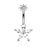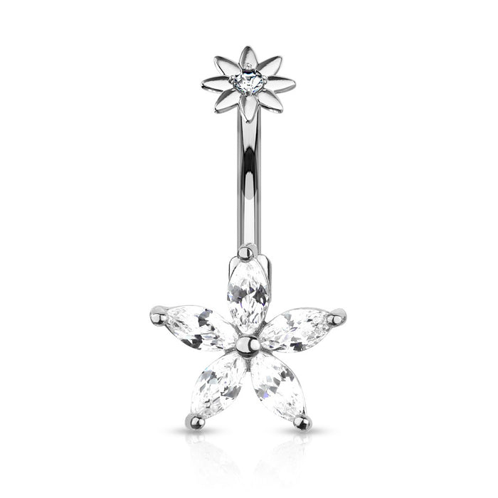 5 marquise Cubic Zirconia petals create this sparkling flower belly ring. Available in gold plated, silver, and rose gold plated. Internally Threaded CZ Center with small flower top. 316L Surgical Steel naval ring. 14 GA. 3/8" barbell.