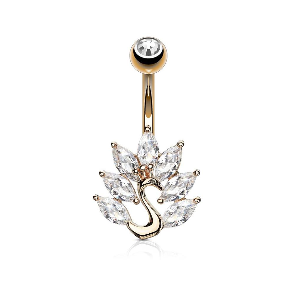 Marquise Peacock Belly Ring in Rose Gold. Gorgeous Cubic Zirconia gems surround this beautiful bird. 14 GA. 3/8" barbell. 316L surgical steel material. 5mm ball top. Elegant and Classy.