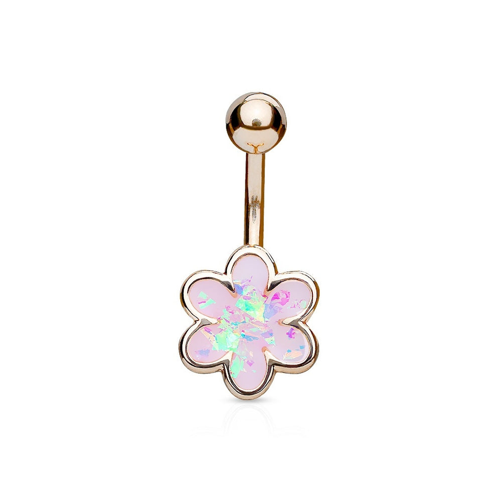 Opal Glitter Filled 6 Petal Flower belly ring. 316L Surgical Steel material. Cute, sweet and a great size! Rose Gold and sparkling white are the perfect combo. 14GA. 3/8" barbell. 5mm ball top. Synthetic opal belly ring.