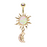 Gold Plated Opal Sun Moon Belly Ring. The sun and moon come together romantically in this celestial belly button ring. 14GA. 3/8" barbell. Surgical Steel material. Dangle length is 1/2".