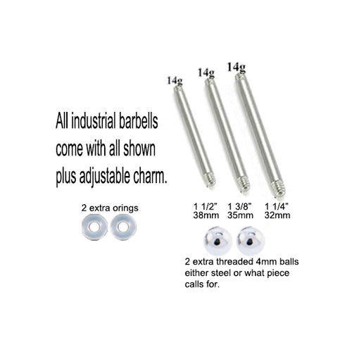 Peacock Feather Industrial Barbell. Great color and just the right amount of sparkle with the beautiful blue and green swarovski crystals. Three industrial bar sizes included so this industrial jewelry is sure to fit your industrial piercing size. 14 GA. 316L Surgical Steel material. Includes 3 barbell lengths: 1-1/2", 1-3/8", 1-1/4". Also comes with four 4mm steel balls