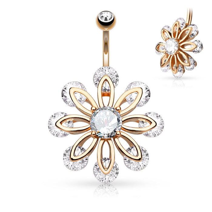 CZ Set Ends 8 Petal Flower with Round CZ Center 316L Surgical Steel Belly Button Navel Ring. Beautiful rose gold flower with cubic zironia gemmed petals. Non dangling. Flower is 3/4" wide. 14GA. 3/8" barbell. Flower belly rings are a staple in everyone's wardrobe. Pair this with a tee and a jeans or your favorite bikini. Also available in Silver.