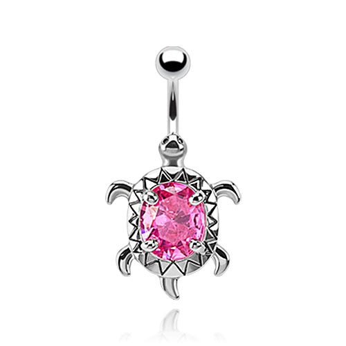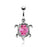 Show off your love of the sea with this cute turtle belly button ring. The large cubic zirconia gem gives off a unique look to this fun loving non dangling belly button ring. - 14 Gauge - 3/8" Barbell Length - 316L Surgical Steel - 1 1/2" End to End Length - 13/16" Width - Non dangle turtle with pink oval CZ shell. Also available in Purple, Clear and Aqua.