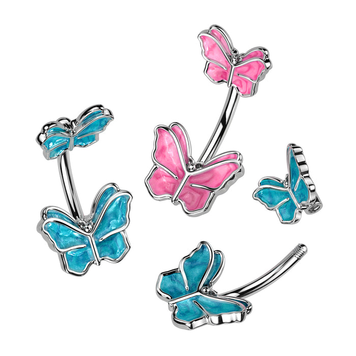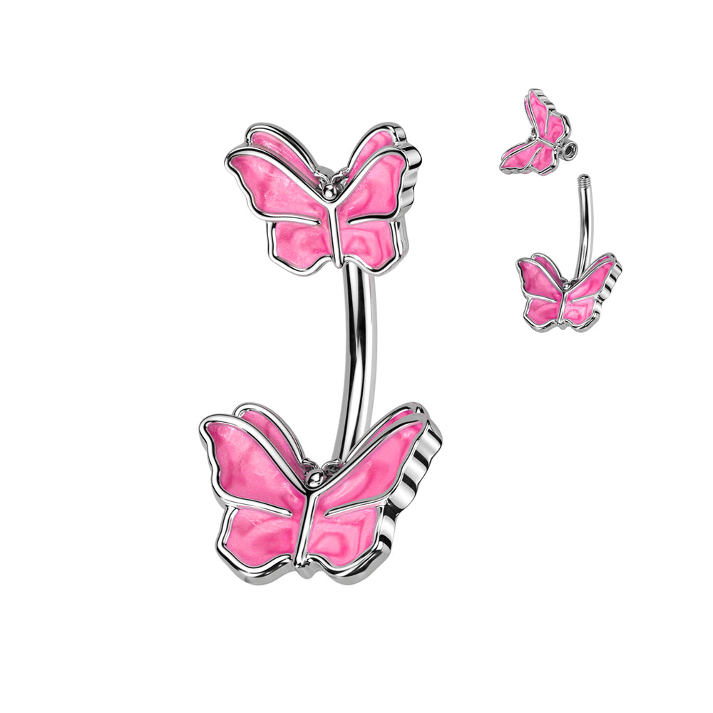 Pink 316L Surgical Steel Belly Button Ring With Double Butterfly