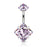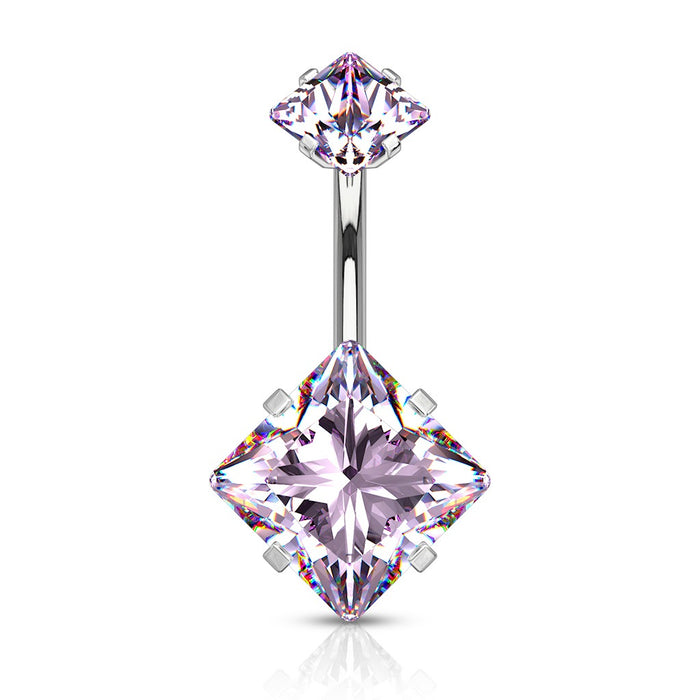 Square CZ Prong Set Internally Threaded Top Double Jeweled Belly Ring. 316L Surgical Steel. Cubic Zirconia gems available in: Clear, Rose Gold, Purple, Aqua, and Pink. So much sparkle! 14GA. 3/8" barbell. 5mm X 8mm.