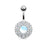 White Reflecting Stone Center Gem Paved Round Flower 316L Surgical Steel Belly Button Navel Ring. Sparkle and Shine in this beautiful natural stone flower belly ring. 14GA. 3/8" barbell. 5mm ball top.