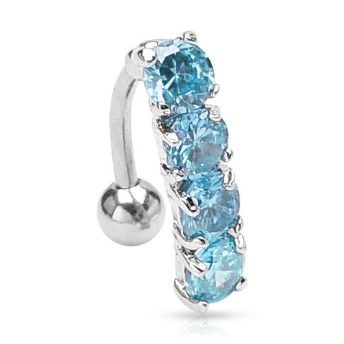 The reverse aqua gem drop belly button ring is enticing with the bright oceanic blue of the cubic zirconia gems. Get lost in the sea blue aqua color shimmering from this reverse belly ring. Your navel is going to be hard to miss with this eye catching reverse aqua gem drop navel ring. Feel beatiful as you walk to your car, walk to class, or walk down the beach while wearing this stunning reverse aqua gem drop belly ring.