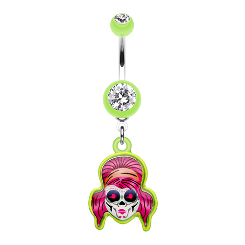 Rockabilly Sugar Skull Belly Ring. Get ready for Halloween or any rockin' day or night! This adorable sugar skull belly ring is a bright vibrant lime green and features a colorful sugar skull. 14GA. 3/8" barbell. 316L Surgical Steel material.