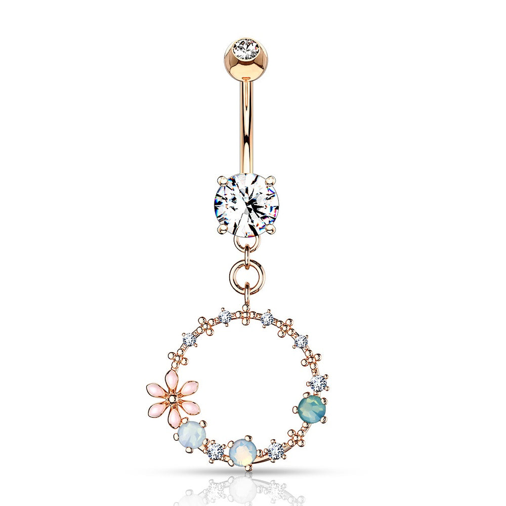 Double Jeweled Prong Set with Enamel Flowers and Opalite Stone Set Circular Dangle 316L Surgical Steel Belly Button Navel Ring. So delicate and stunning! Subtle colors and the perfect amount of sparkle! Circle is 1/2" wide. 14GA. 3/8" barbell. 5mm ball top.