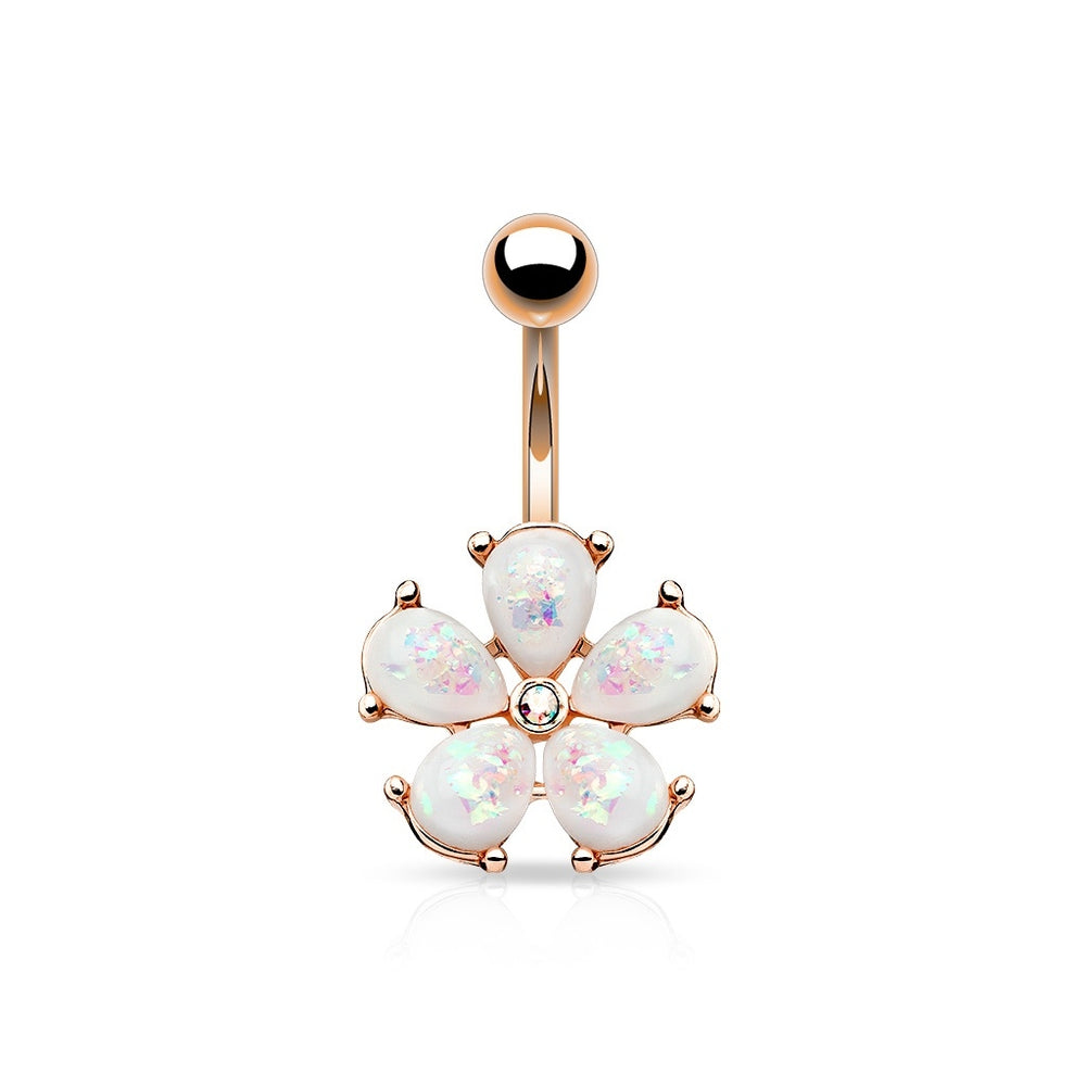 Opal Glitter Petals with Crystal Center Flower. 316L Surgical Steel Belly Button Navel Ring. 14 GA. 3/8" barbell. Flower is 1/2" wide. Available in gold, silver and rose gold. Flower belly rings are so popular! Add an opal and you've got a staple in your collection!