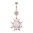 Rose Gold Illuminating Sun Belly Ring. The sun shines bright in this celestial dangling belly button ring. Iridescent colors in a glossy finish make this one a stunning choice. 14GA. 3/8" barbell. Surgical Steel material. Dangle length is 1/2".