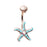 Rose Gold Under the Sea Belly Ring features a turquoise covered starfish with iridescent center gem and shell with iridescent gem. Rose gold plated surgical steel material. Top and Bottom belly rings are fun and can add an extra touch to any outfit! This one is perfect for the beach or any day of the week! Think spring break or summer! 14 GA. 3/8" barbell. Total length from top to bottom is 1 3/8".