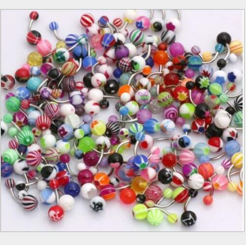 100 different belly rings. Give yourself the treat of the ultimate grab bag when you purchase this pack of 100 - yes, you read correctly - ONE HUNDRED individual belly button rings. Each selected navel ring that is included in this set of 100 is 14 gauge with a 7/16" length curved barbell made from durable 316L surgical grade stainless steel with multicolored 5mm top and 8mm bottom UV acrylic ball ends. You'll never run out of pierced style with this bag of navel jewelry!