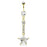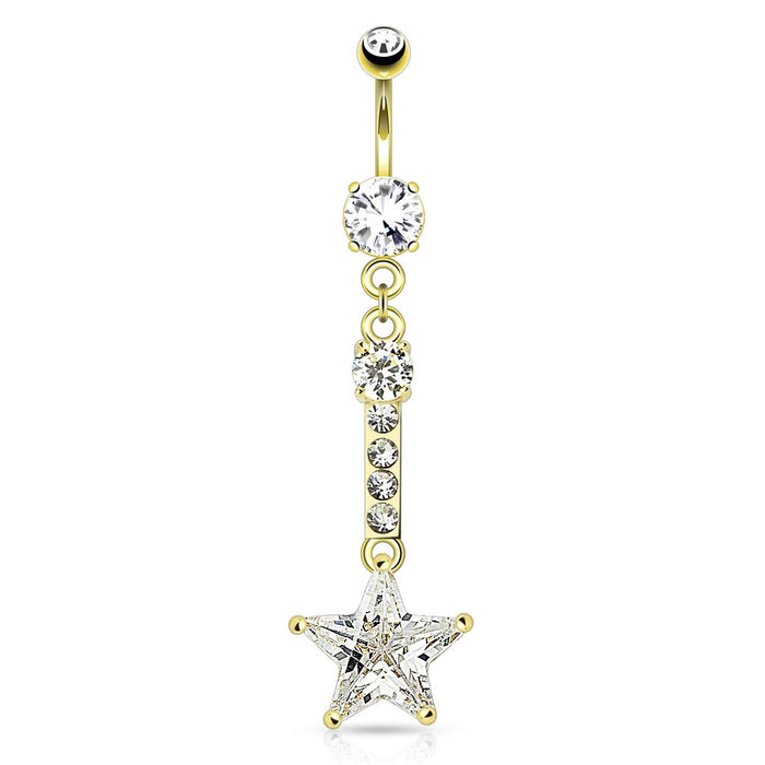 Star Cubic Zirconia Dangle Belly Ring. Dangles 1". Stars are shining in this delicate beautiful naval ring fit for a queen! 14 GA. 3/8" barbell. 5mm ball top. Shiny gold plated over surgical steel.