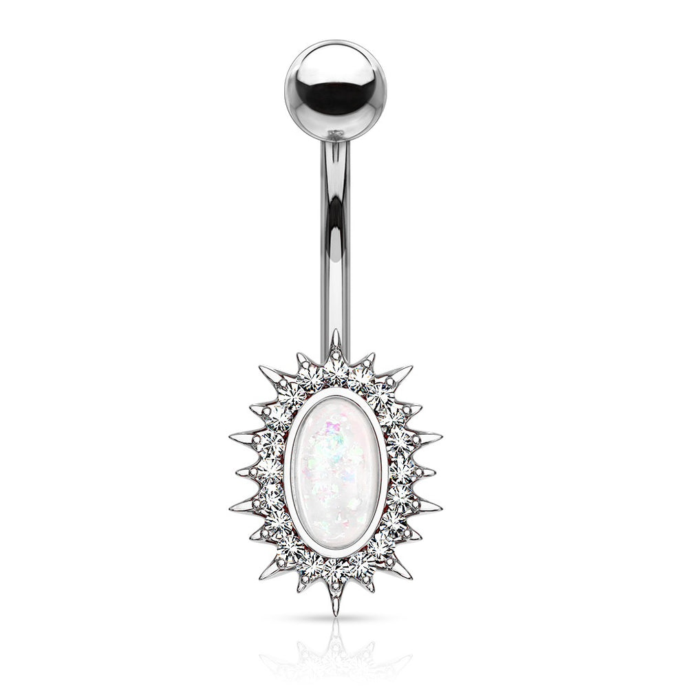 Crystal Paved Sunburst with Opal Glitter Center 316L Surgical Steel Belly Button Navel Ring. Smaller size with a huge amount of sparkle. Classic look and perfect for any occasion! 14 GA. 3/8" barbell. 5mm ball top. White synthetic opal center.