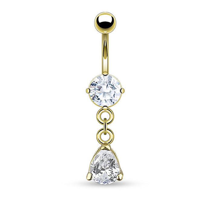 Teardrop-Shaped CZ Dangle 14kt Gold Plated Navel Ring. Tear Drop cubic zirconia clear gem dangles perfectly! Dangle length is 1/2". If you are looking for something simple and stunning, this is the belly ring for you. Also, available in pink and purple.
