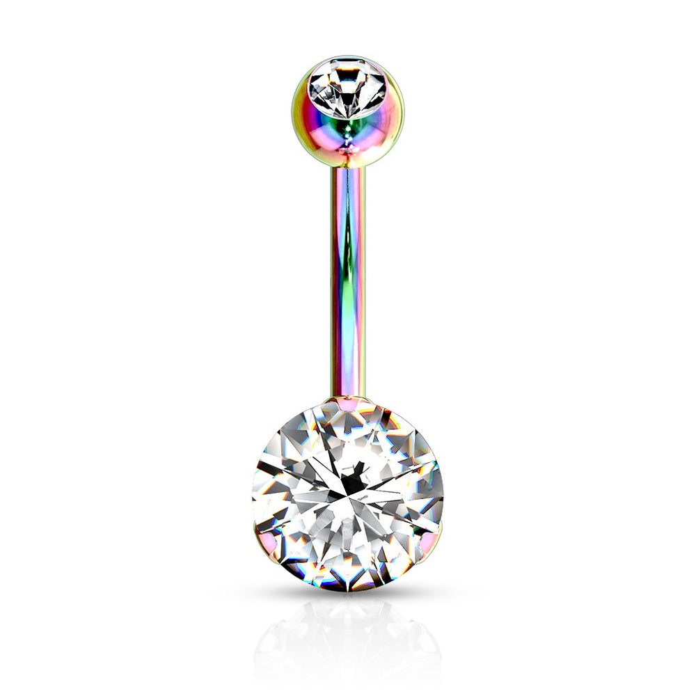 Titanium IP over 316L Surgical Stainless Steel. Prong set 8mm cubic zirconia. 14GA. 3/8" barbell. 5mm ball top. Titanium is the strong, durable, and always has a beautiful shine. Available in Rainbow, Black, Purple, Green, Blue, Pink, and Aqua.