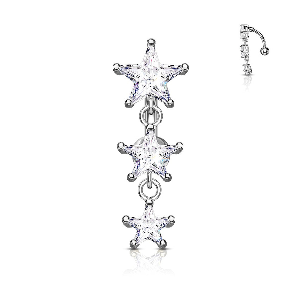 Three Prong Set Star CZ Vertical Drop 316L Surgical Steel Top Drop Belly Button Navel Ring. 14 GA. 3/8" barbell. Clear stars drop beautifully and shimmer and shine! You'll love this for July 4th and every other day of the year!